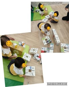 0歳児の牛乳パックブロックを押したり、穴をのぞいたりしていました🤗