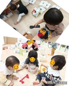 お友だちと一緒にブロックを積み上げたり、囲いを作ったりして遊んでいましたよ🤗