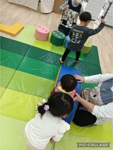 バランスをとりながら、一人ずつ段差を降りたあと、下からお友だちの名前を呼んだり…