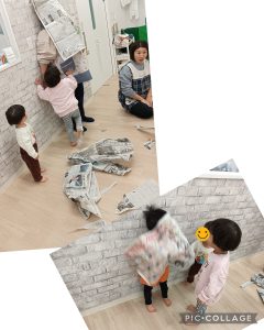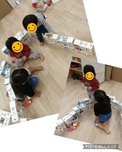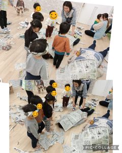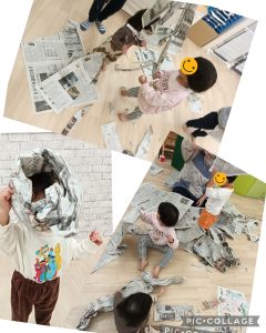 新聞紙をちぎったり、丸めたりしたながらいろんな形を作って楽しんでいましたよ👀✨