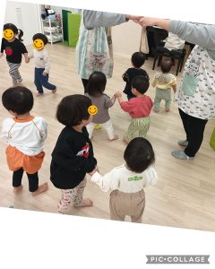 ド・レ・ミーの音階を表現したあとは、「さんぽ」の曲に合わせて手つなぎで歩きました👫
