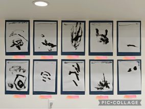 先生が大きな袋に絵を描いて