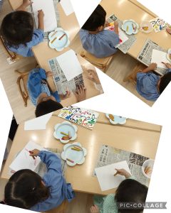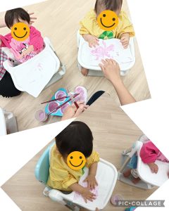 えのぐを使って遊ぶときの準備は何かな?と話すと「スモック〜」と答えていましたよ!