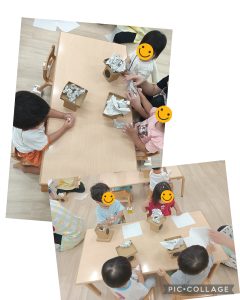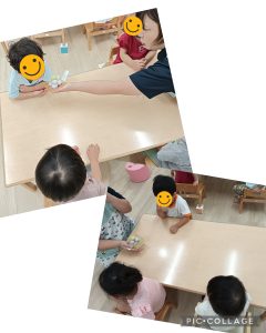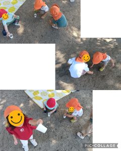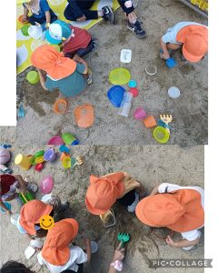 砂場セットで型はめをしたり、しゃぼん玉をしたりして遊びました。