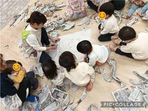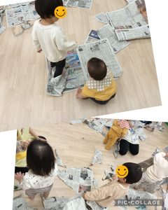 部屋いっぱいに新聞紙を広げておもいっきり遊びました!!